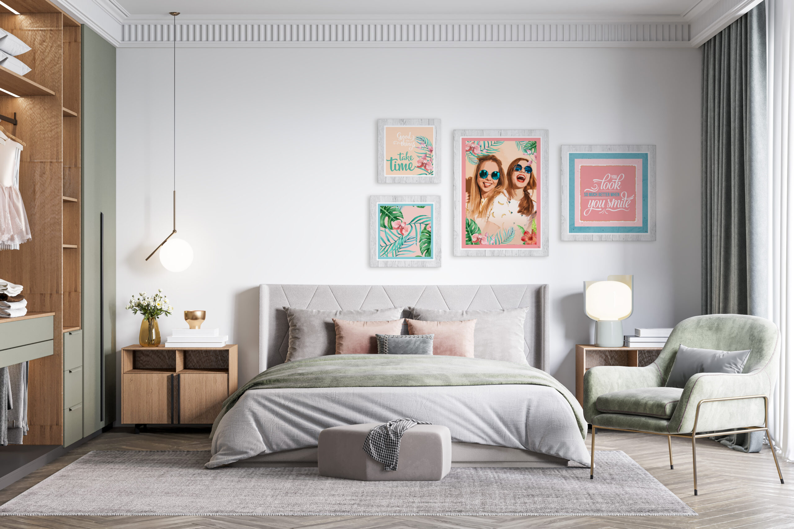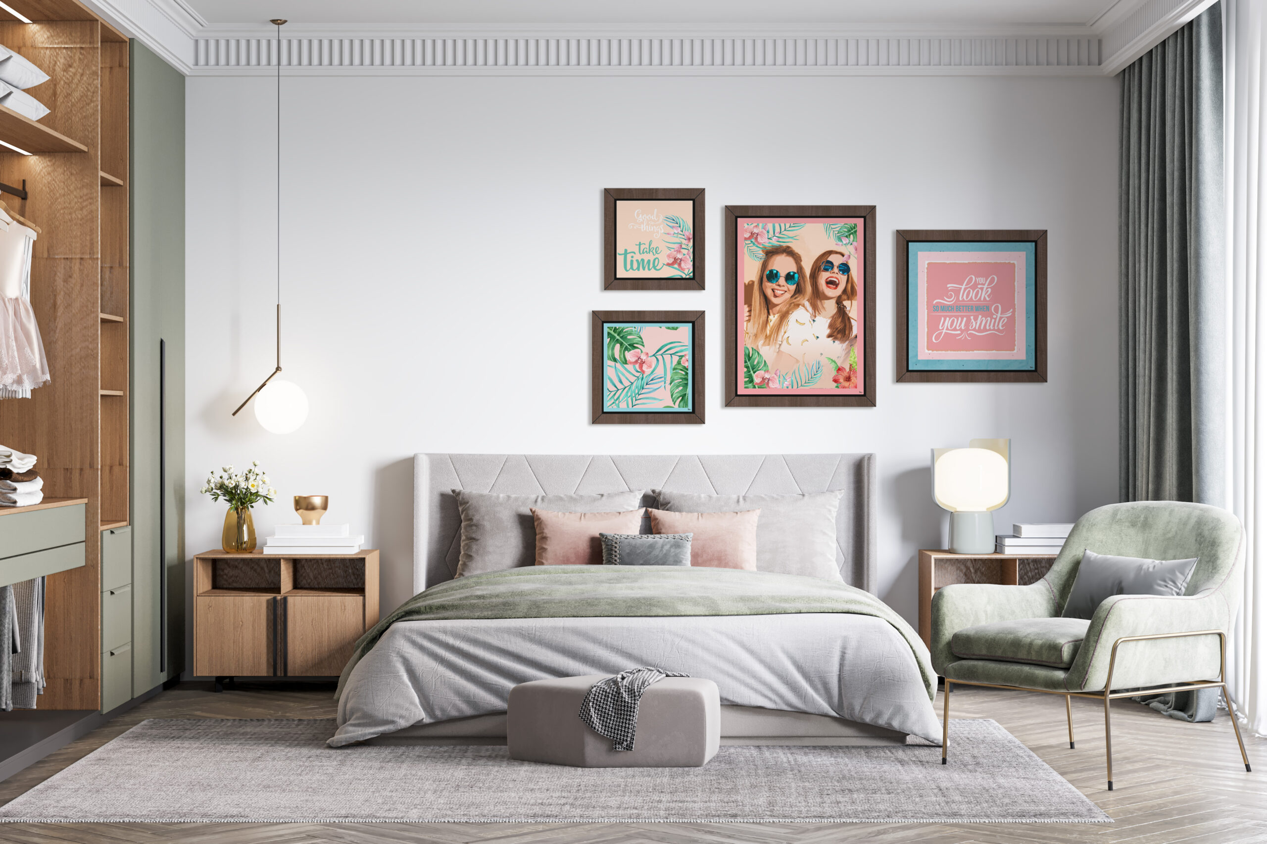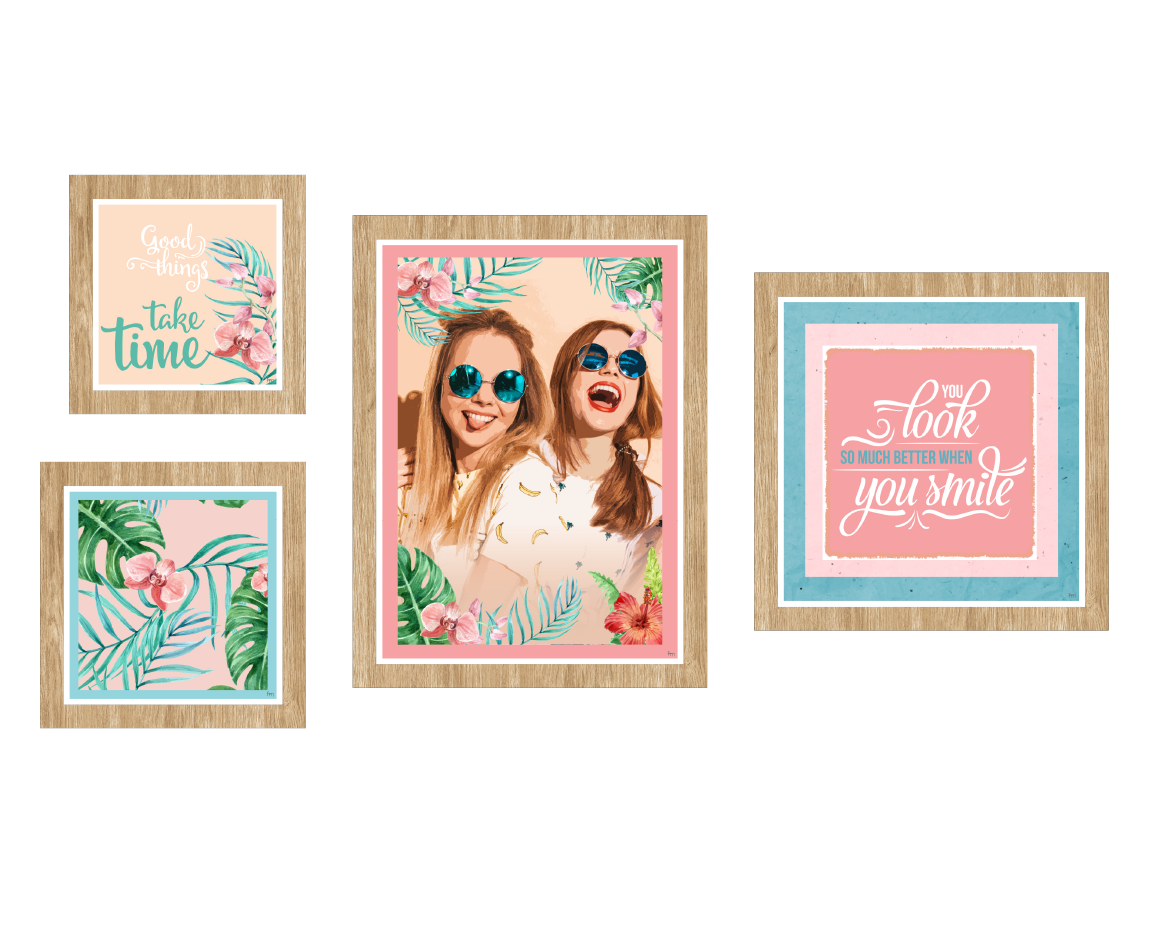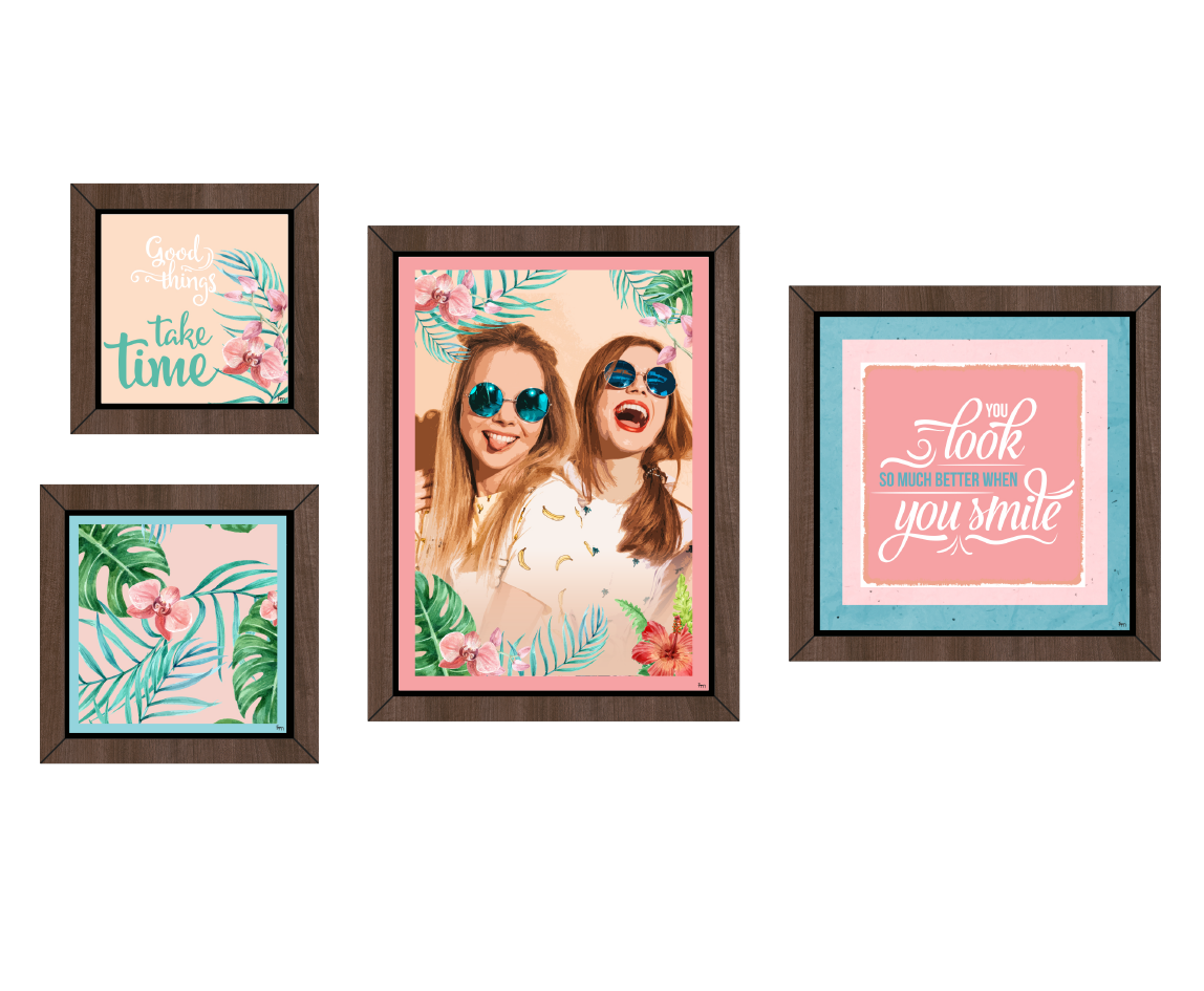 • Conjunto de 4 quadros com molduras em PVC impresso, imitação de madeira.