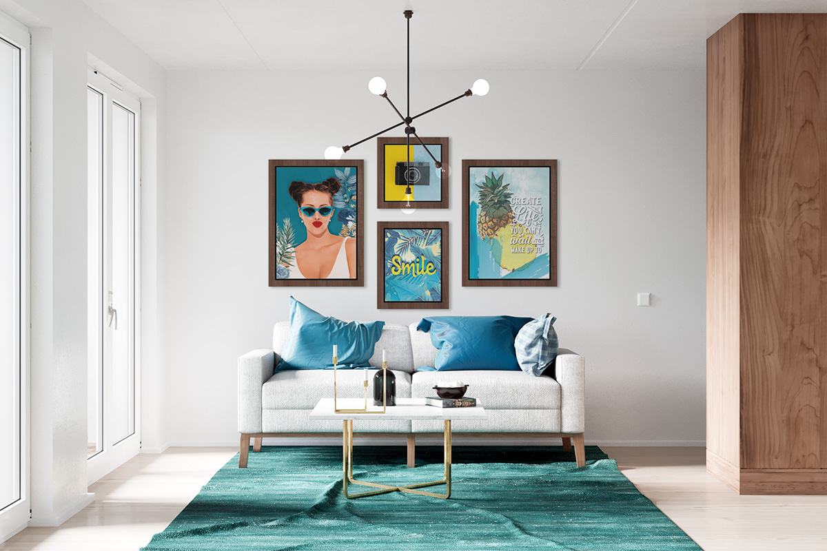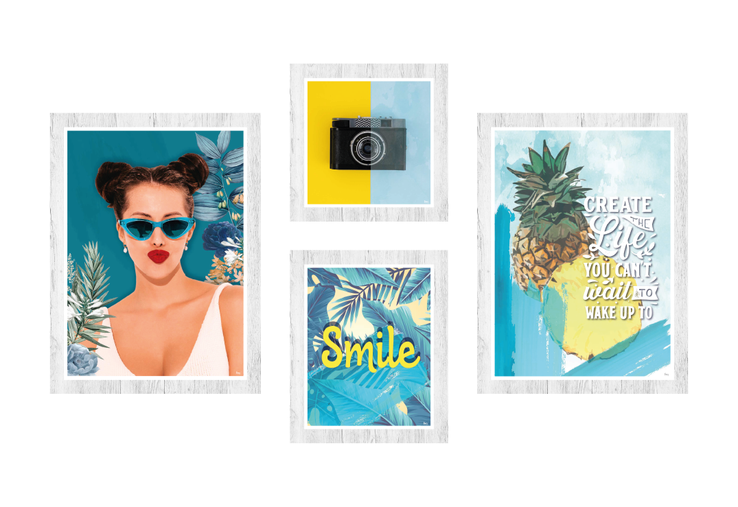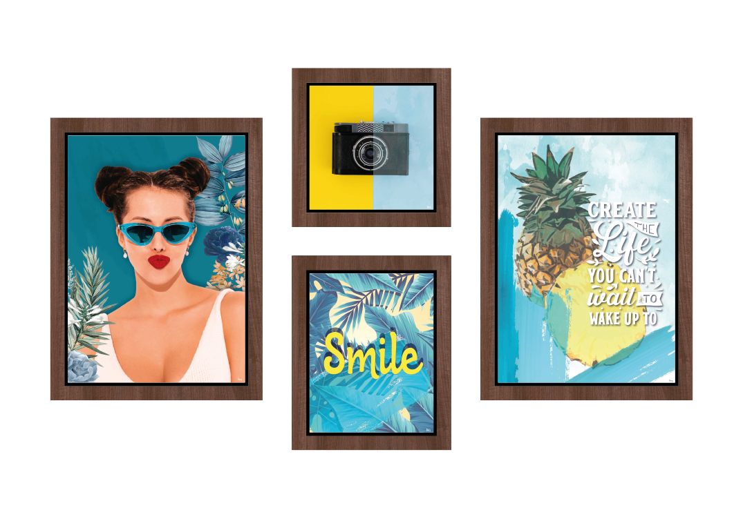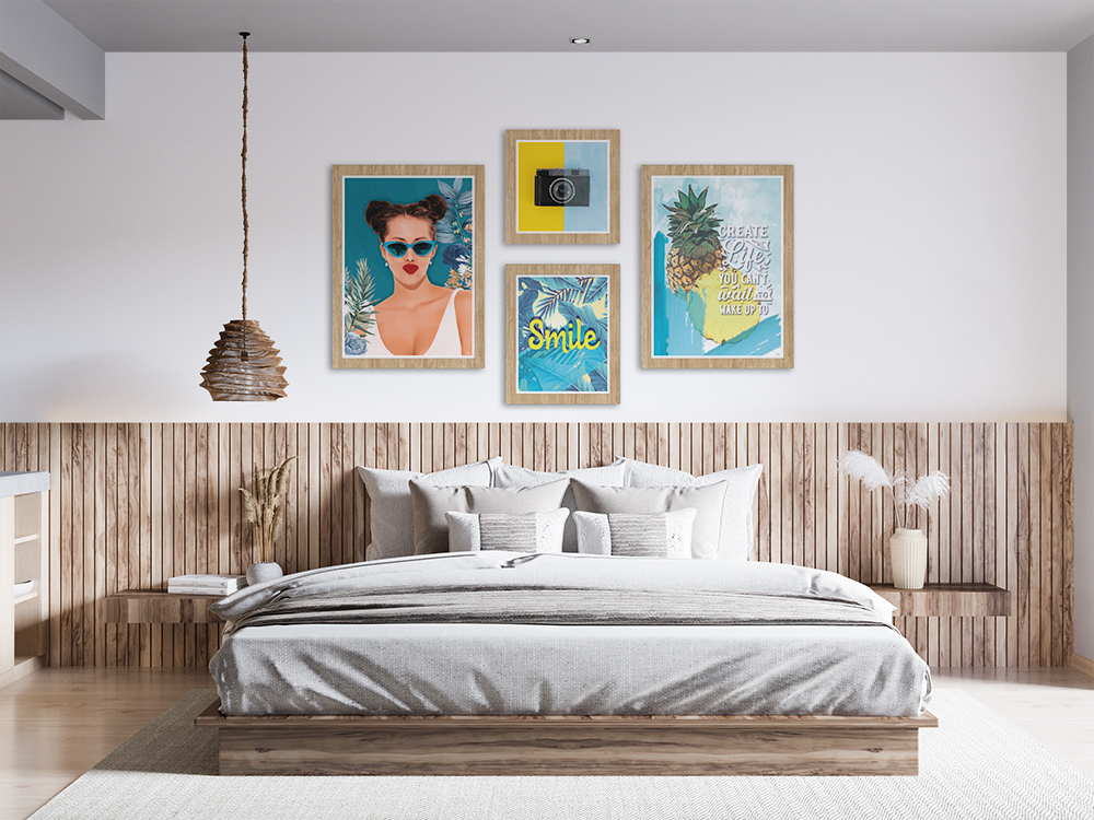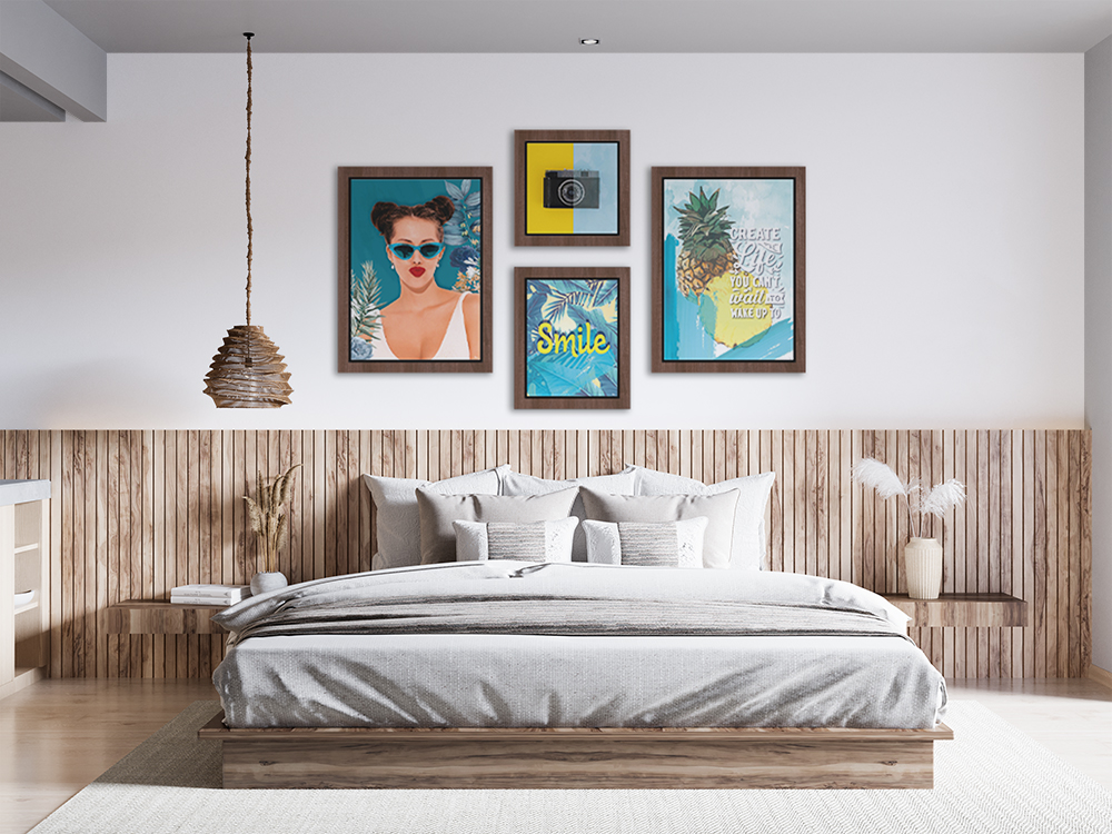 - Conjunto de 4 quadros com molduras em PVC impresso, imitação de madeira.
