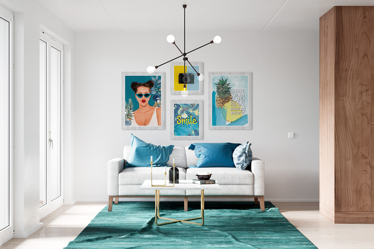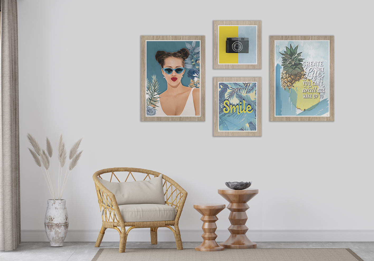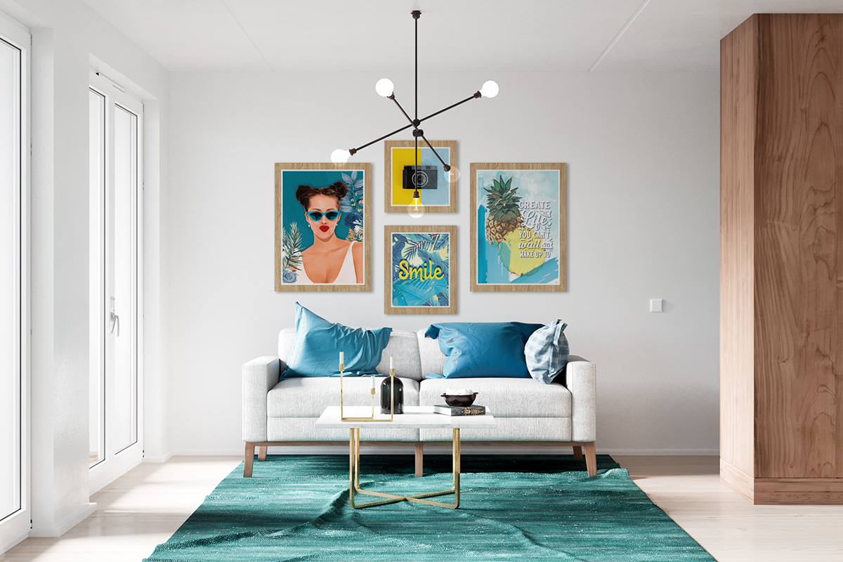 - Conjunto de 4 quadros com molduras em PVC impresso, imitação de madeira.