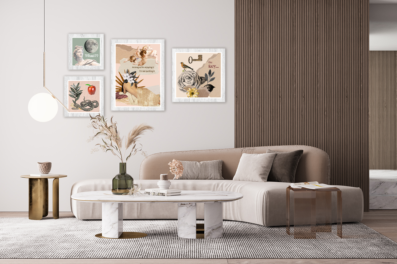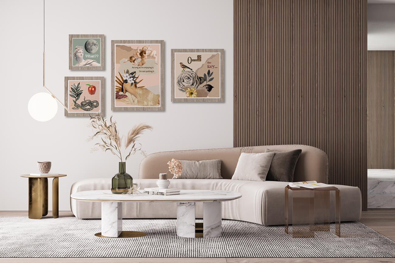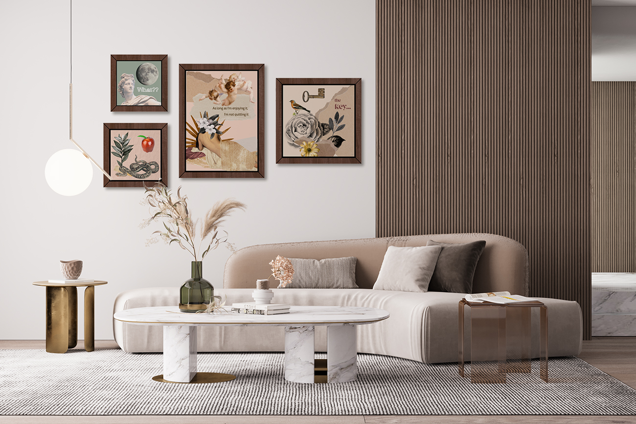 - Conjunto de 4 quadros com molduras em PVC impresso, emitação de madeira.