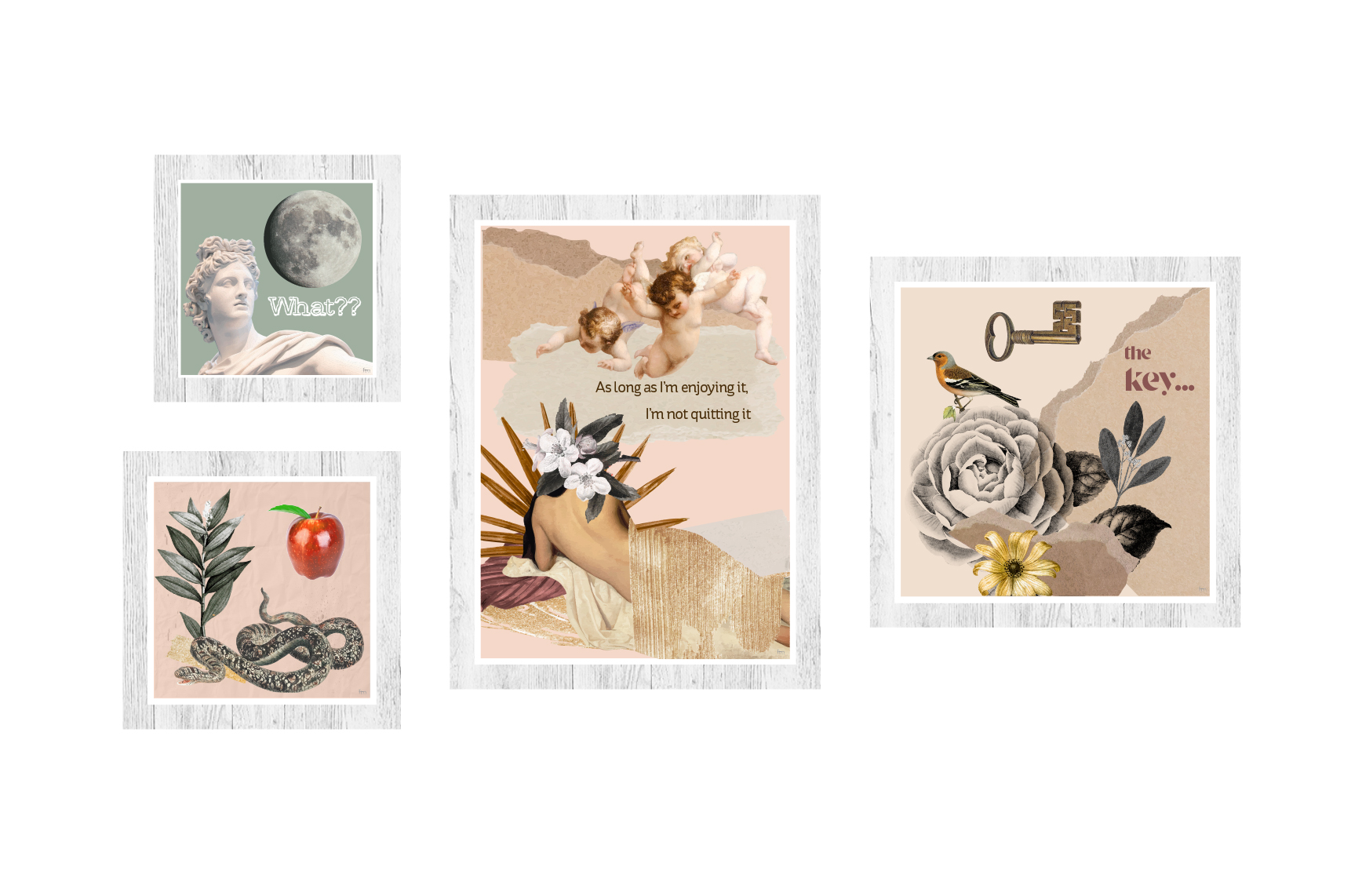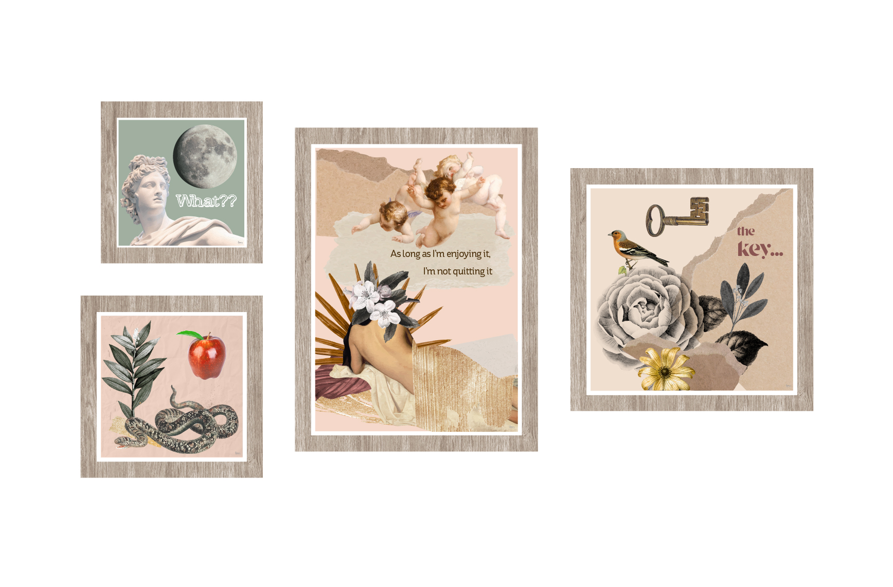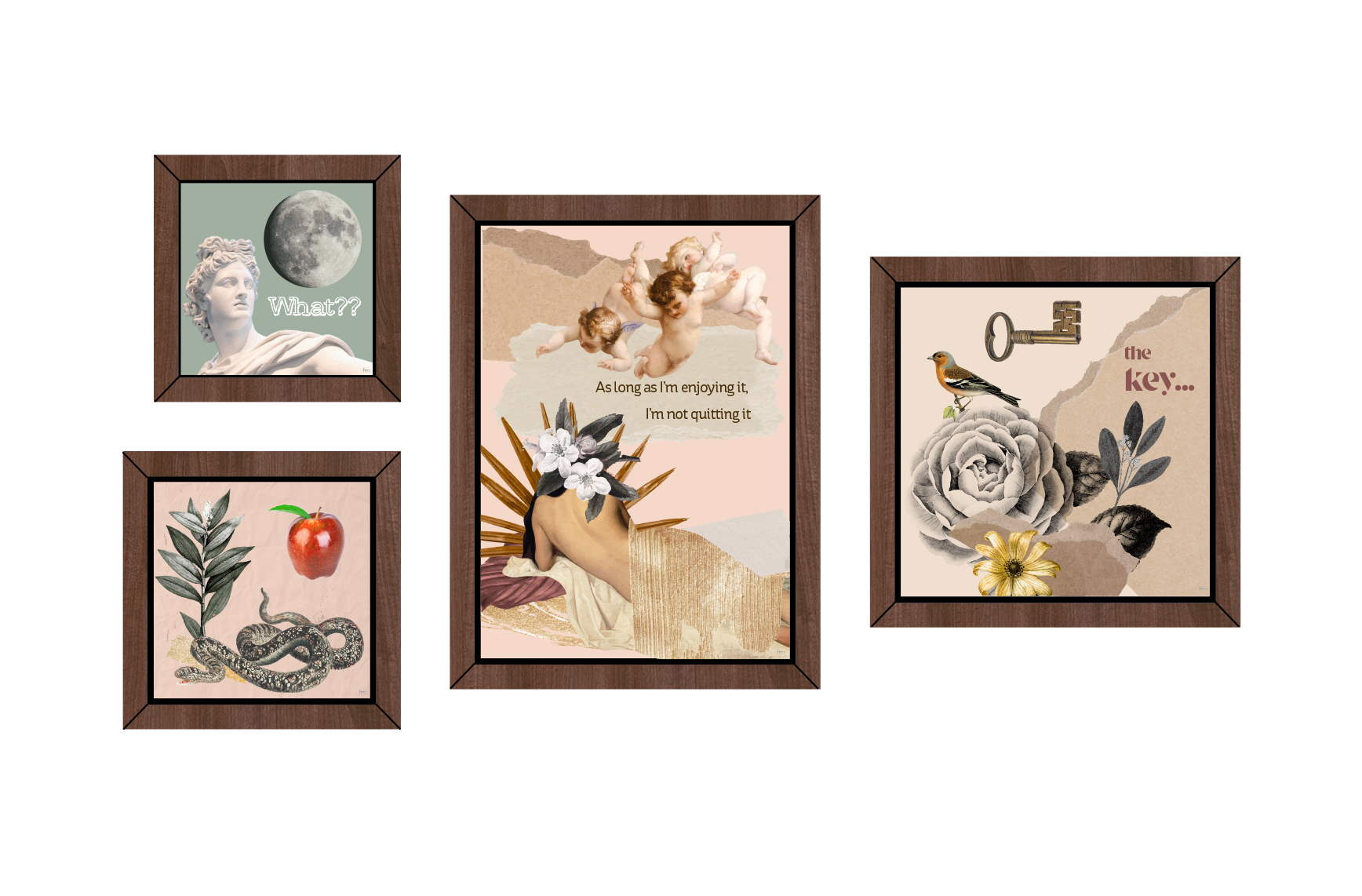 - Conjunto de 4 quadros com molduras em PVC impresso, emitação de madeira.