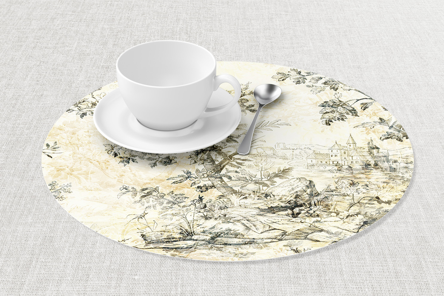 Temos também a possibilidade de ter o mesmo layout para marcadores de pratos, onde podem complementar-se com a toalha, corredor de mesa, naprons ou guardanapos.