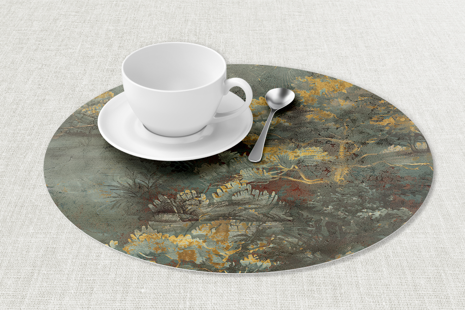 Temos também a possibilidade de ter o mesmo layout para marcadores de pratos, onde podem complementar-se com a toalha, corredor de mesa, naprons ou guardanapos.