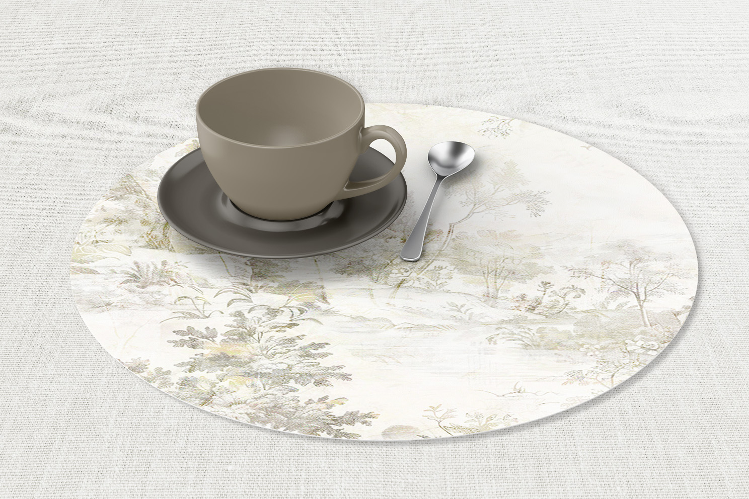 Temos também a possibilidade de ter o mesmo layout para marcadores de pratos, onde podem complementar-se com a toalha, corredor de mesa, naprons ou guardanapos.