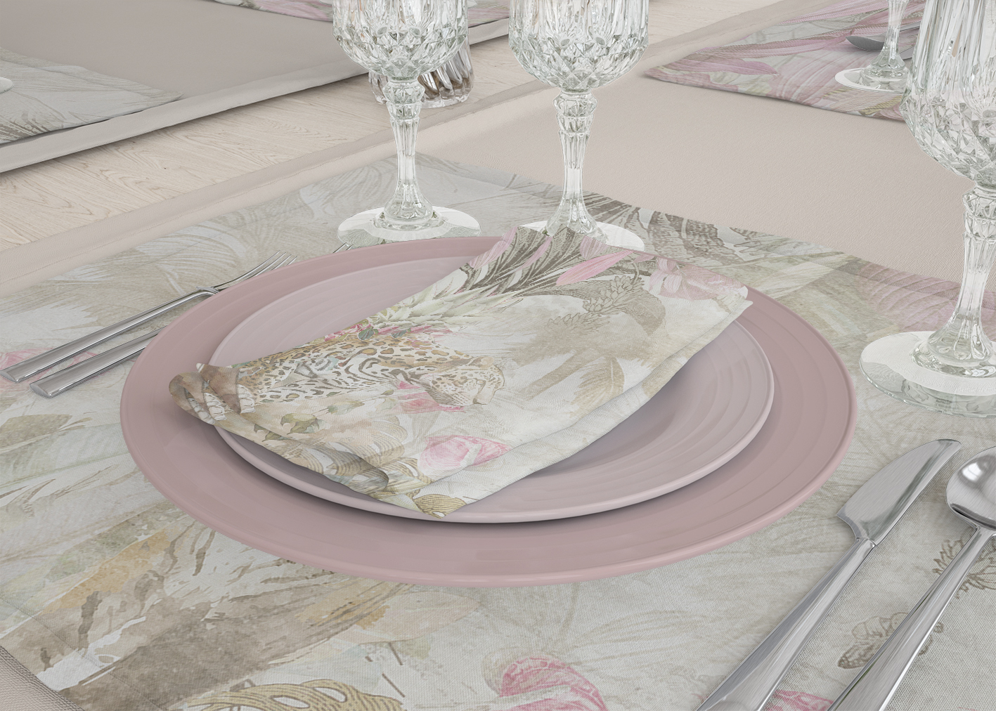 Temos também a possibilidade de ter o mesmo layout para marcadores de pratos, onde podem complementar-se com a toalha, corredor de mesa, naprons ou guardanapos.
